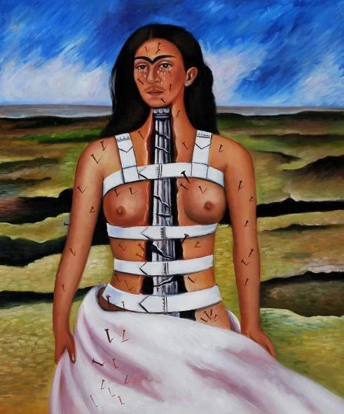 Les autoportraits se sont imposés à elle. Elle se peint parce qu’elle se regardait des heures dans un miroir au-dessus de son lit. Elle peint ce corps qui était là. Comme si elle n’avait pas d’autre choix. Un face à face avec son corps immobilisé. Son corps apparaît sans détour, ses blessures montrées, ses douleurs peintes. “Je me peins moi-même parce que je suis souvent seule.”